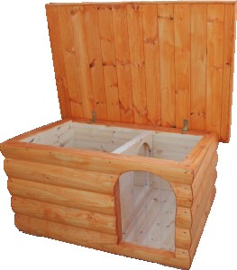 Unsere isolierten Hundehütten halten im Innenraum eine Temperatur, die im Vergleich zur Außentemperatur um 5–12 °C angenehmer ist.